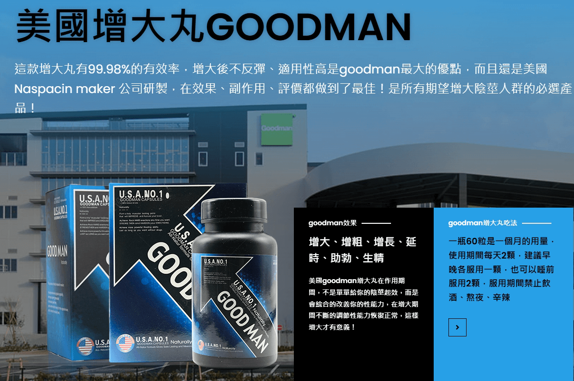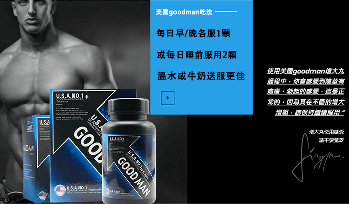 GOODMAN增大丸(好男人膠囊) 是專為男性設計的高效增強產品,幫助增大陰莖,提升性功能。每日服用二顆,連續三罐可見明顯增大效果,三罐以上效果更加顯著。一個療程平均可增長1-2CM,粗度增加25%-30%,並有效改善性功能的穩定性與持久力。美國GOODMAN增大丸適用於18-60歲成年男性,讓您在自信中提升男性魅力。