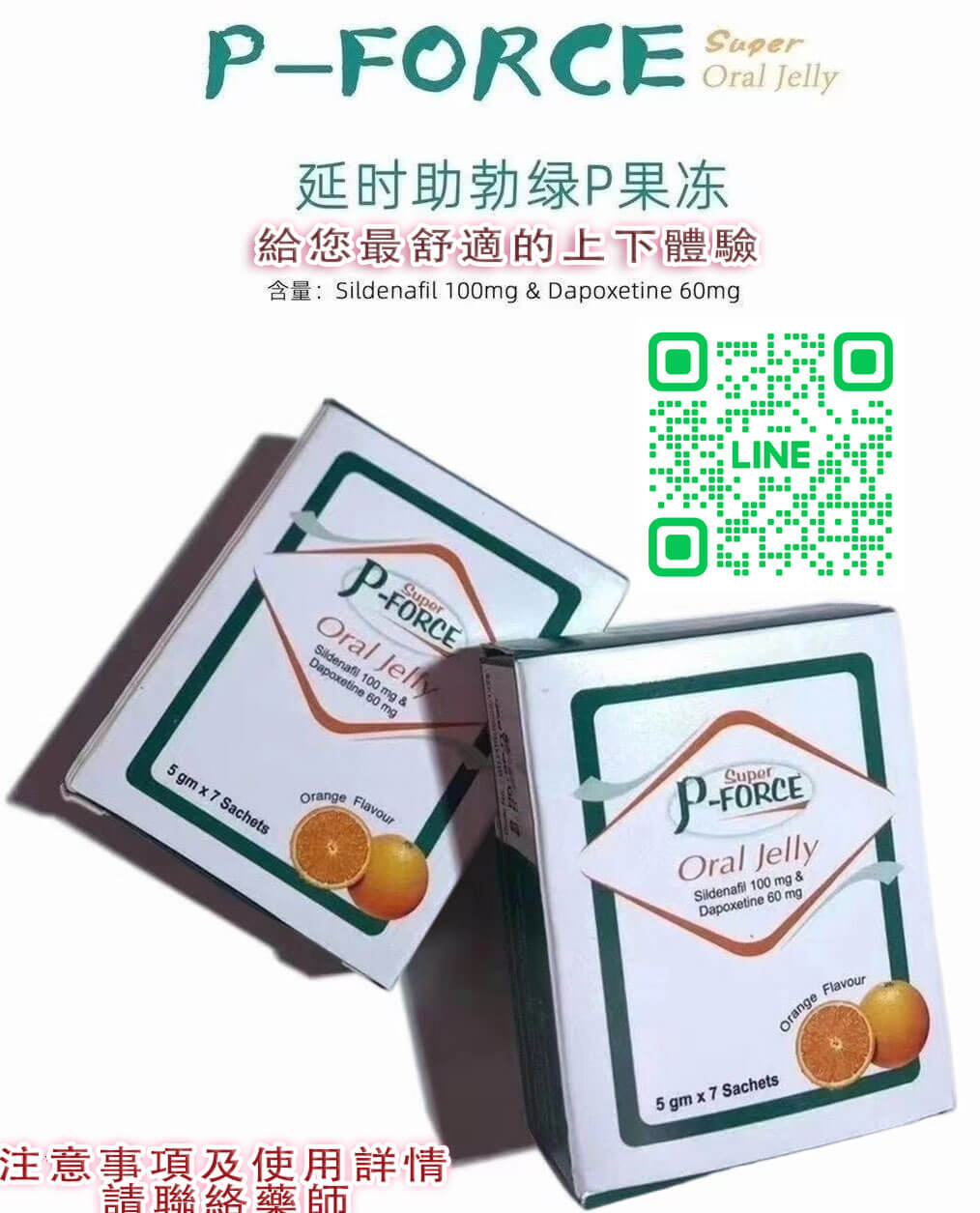 建議於性活動前 30 至 60 分鐘服用一包:雙效綠果凍 Super P-Force Oral Jelly   6小內最大劑量為160mg(一小包)。