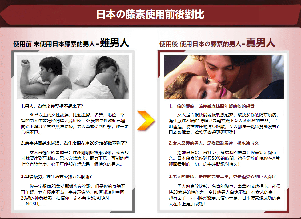 無論是追求即戰力的臨時提升,還是希望從根本調理、恢復年輕活力,日本藤素都是您的最佳選擇。它不僅強化勃起、延長性愛時間,更能全面補腎壯陽、提升整體性功能與體力表現。選擇正品日本藤素,找回自信、重燃激情,讓您重新掌握主導權,綻放屬於男性的魅力高峰!