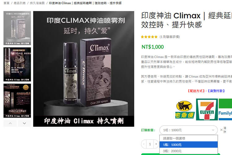 • 印度神油 Climax 屬於進口私密商品,台灣藥局通路不常引進此類非處方延時用品